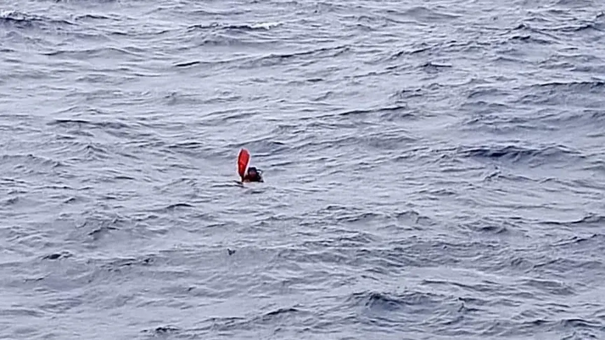 Кадр фиксирует момент, когда дайвера замечают с лодки. Он подаёт сигнал, размахивая красной ластой.